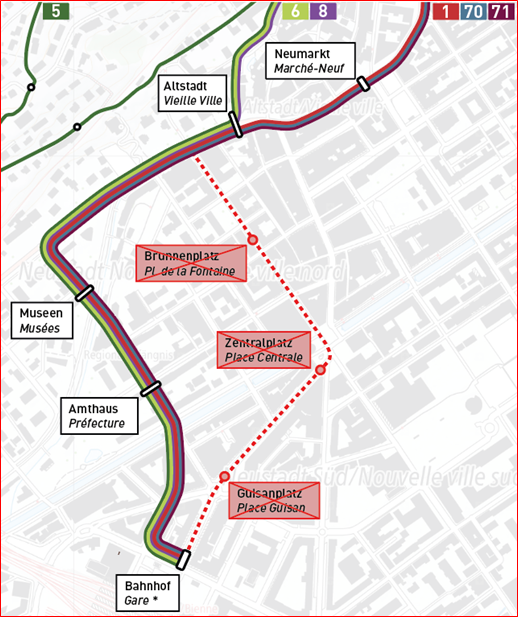 Aufgrund von Bauarbeiten am Zentralplatz werden die Buslinien 1, 5, 6, 8, 70 und 71 am Mittwoch, 11. Februar 2026 von 6.00 Uhr bis ca. 20.00 Uhr gemäss untenstehendem Plan über die Spitalstrasse umgeleitet.