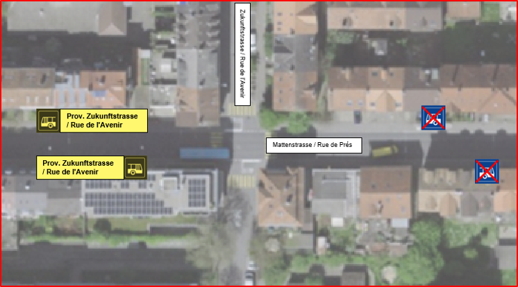 Wegen Bauarbeiten wird die Haltestelle Zukunftstrasse in beiden Richtungen ab Dienstag, 10. Februar 2026, 07:30 Uhr bis auf Weiteres um ca. 50 m verschoben (siehe Plan unten).