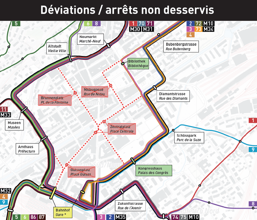 Du vendredi 20 février (dès 13h30) jusqu’au dimanche 22 février (fin du service), le centre-ville n’est pas desservi. Les arrêts Place Guisan, Place Centrale, Rue de Nidau et Place de la Fontaine sont supprimés dans les deux sens. Les bus sont déviés par la rue de l'Argent ou la rue de l'Hôpital. L’horaire en ligne est modifié.