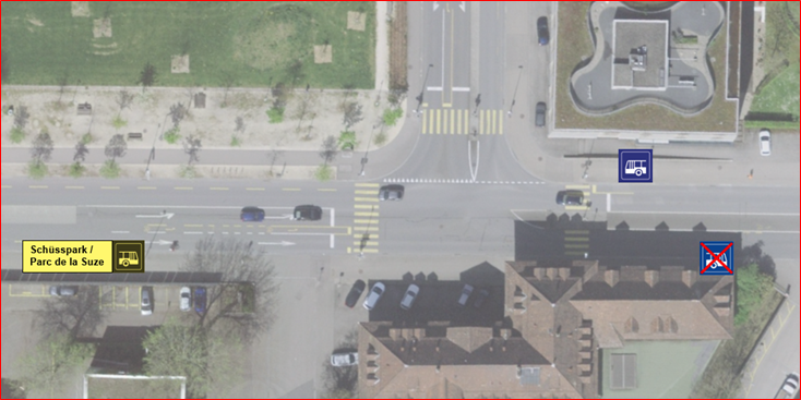 En raison de travaux à l’arrêt Parc de la Suze (direction Écoles Tilleul) est déplacé de 90 m vers le Palais des Congrès, selon le plan ci-dessous, à partir du lundi 24 novembre 2025 dès 12h00 et ce jusqu’à nouvel avis.