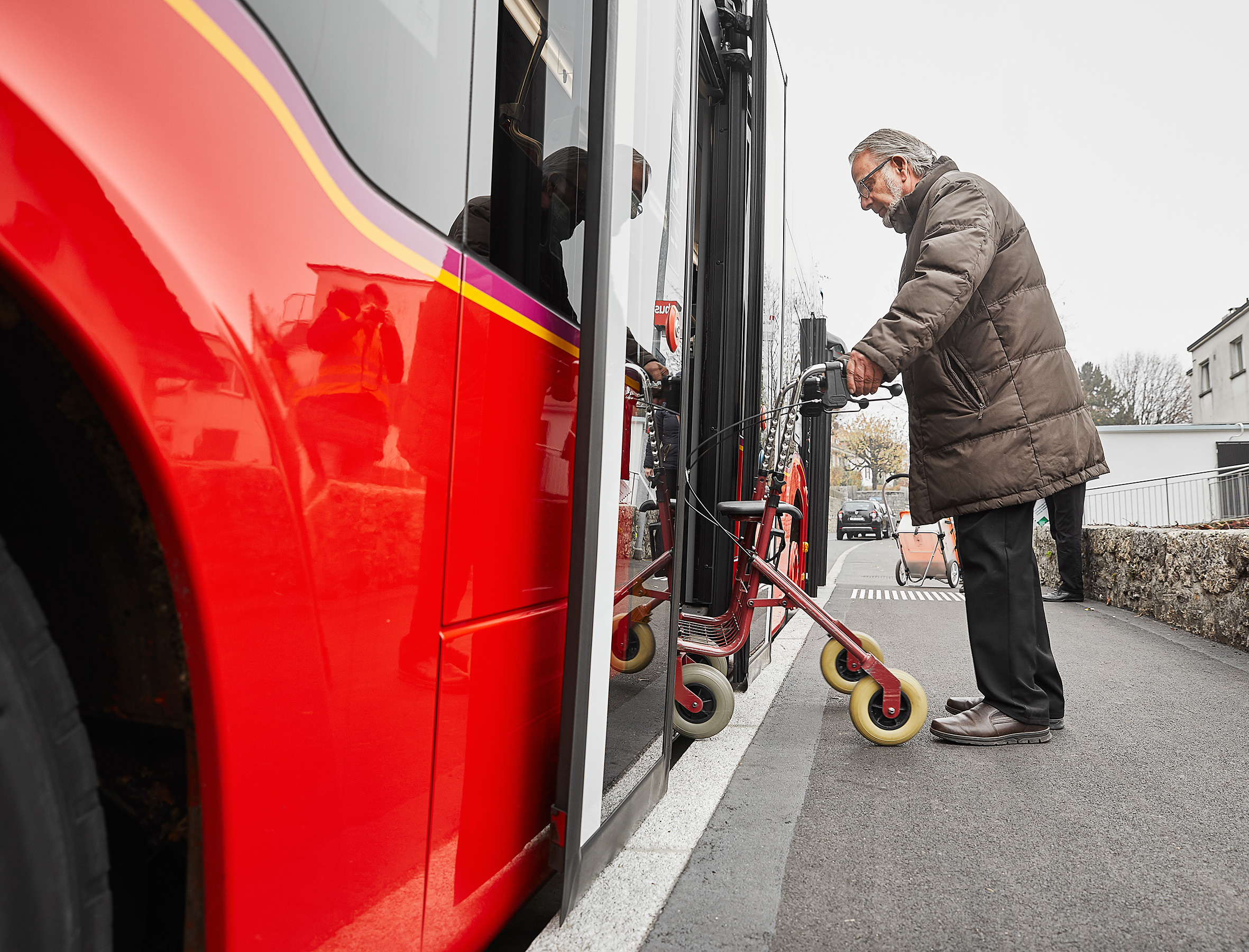 Quand une personne occupe le siège réservé, tout à l’avant à droite, la conductrice ou le conducteur l’aide à descendre au bon arrêt. Les arrêts sont par ailleurs annoncés en allemand et en français par haut-parleur.